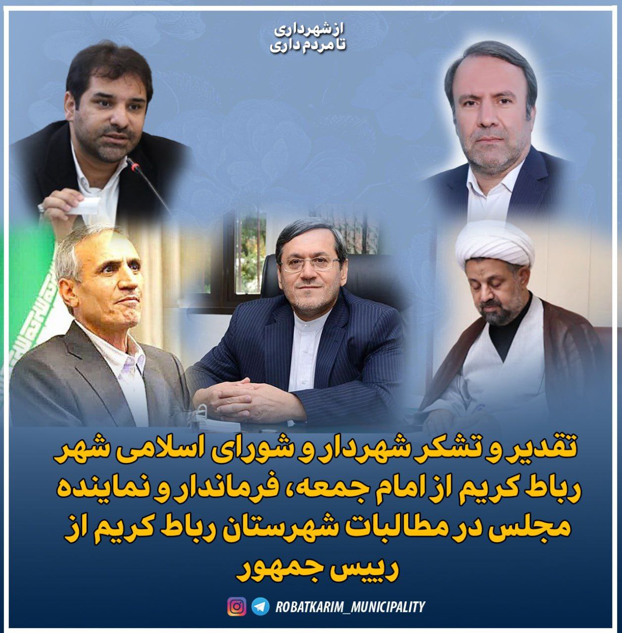تقدیر و تشکر شهردار، رئیس و اعضای شورای اسلامی شهر رباط کریم از امام جمعه، فرماندار و نماینده مجلس در مطالبات شهرستان رباط کریم از رییس جمهور