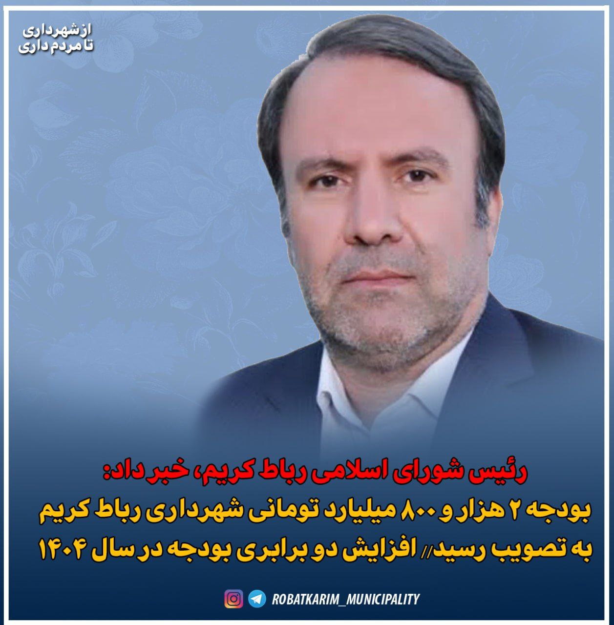 علی بهارلو رئیس شورای اسلامی رباط کریم،از تصویب بودجه ۲ هزار و ۸۰۰ میلیارد تومانی شهرداری رباط کریم خبر داد و گفت: در کنار تصویب بودجه سال آتی که بیش از ۲ هزار و ۸۰۰ میلیارد تومان است، مصوب کردیم تا فعالیت های عمرانی وخدماتی شهرداری در فروردین ماه پیش رو معطل نماند و پروژه های شهری همچون گذشته توسط شهرداری پویا و فعال خواهد بود.